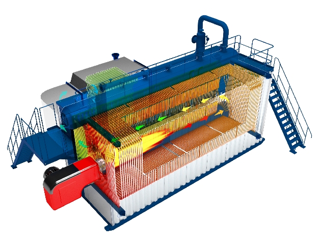在火管锅炉中,燃烧器产生的高温烟气流过被水包围的螺纹烟管,对烟管壁外的水、汽或汽水混合物进行加热,产生蒸汽或热水。