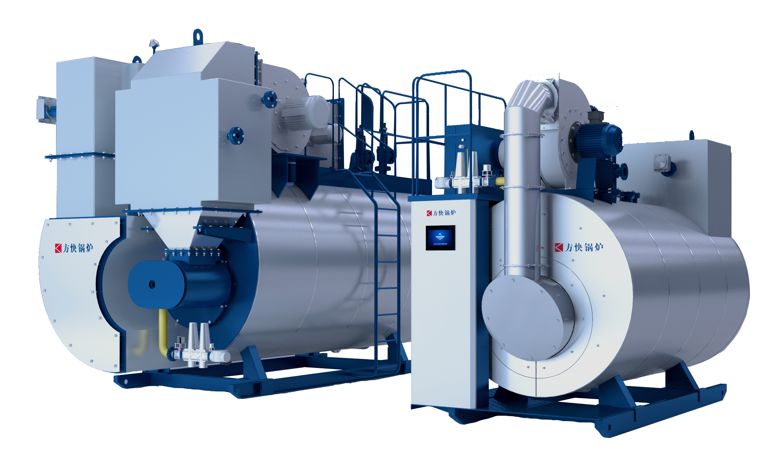 在火管锅炉中,燃烧器产生的高温烟气流过被水包围的螺纹烟管,对烟管壁外的水、汽或汽水混合物进行加热,产生蒸汽或热水。